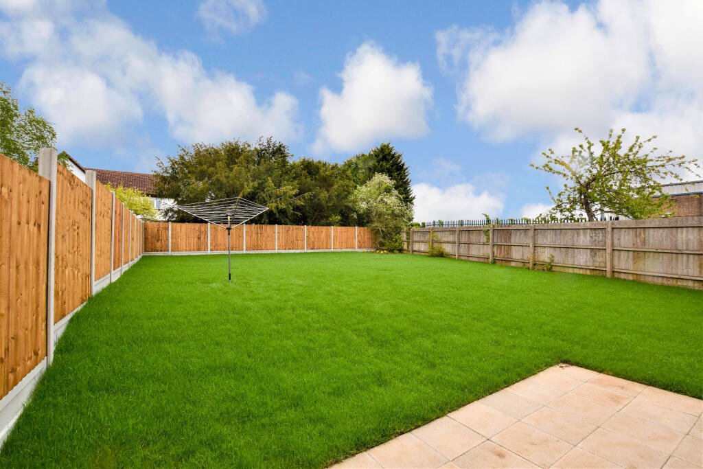 To the rear is a large enclosed garden mainly laid to lawn, accessed via a side gate from the front of the property as well as double patio doors from the living room.