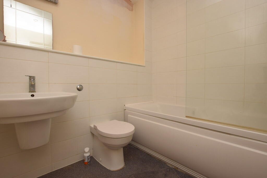 BATHROOM 6′ 06″ x 7′ 00″ (1.98m x 2.13m) Magnolia Painted Walls: White Ceramic Tiles: White Ceramic Toilet: White Ceramic Basin: White Ceramic Bath With Overhead Shower: Vinyl Flooring: Radiator. Â