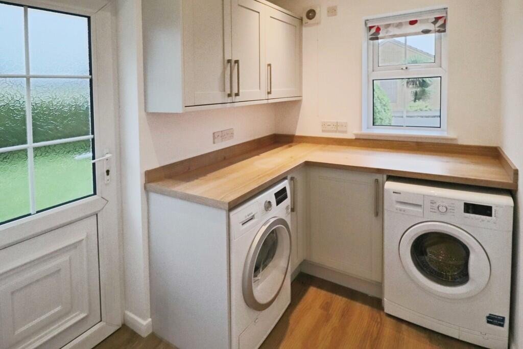 UTILITY ROOM: 7′ 10″ x 5′ 10″ (2.39m x 1.78m) Wall and base units with worktop and space/plumbing for washing machine and door leading out to garden.Â