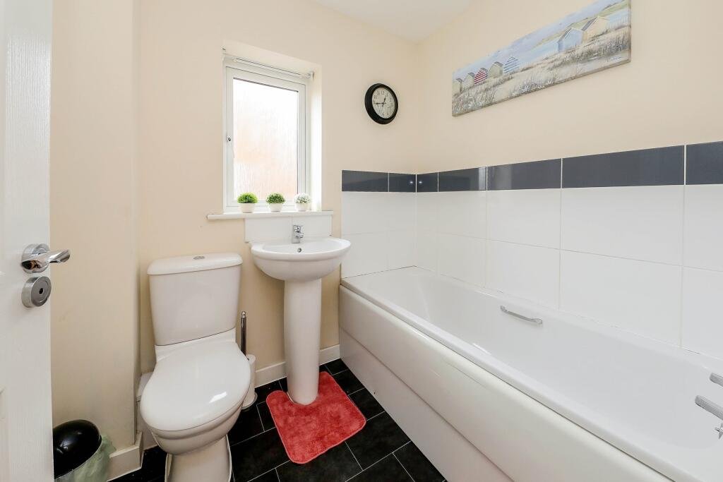 Bathroom Double glazed window to side aspect, suite comprising bath, low level wc, pedestal sink, tiled splash back, extractor fan, radiator.