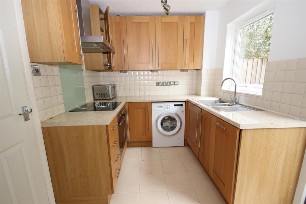 Kitchen – 3.51 x 3.53 (11’6″ x 11’6″) – Rear fitted kitchen with electric hob and oven, fridge freezer, washing machine and slimline dishwasher