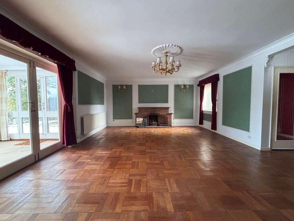 LOUNGE A large, spacious room recently painted with panelled walls and parquet flooring. There are doors leading to the conservatory area with views of the garden. Large pendant fitting with wall lights.