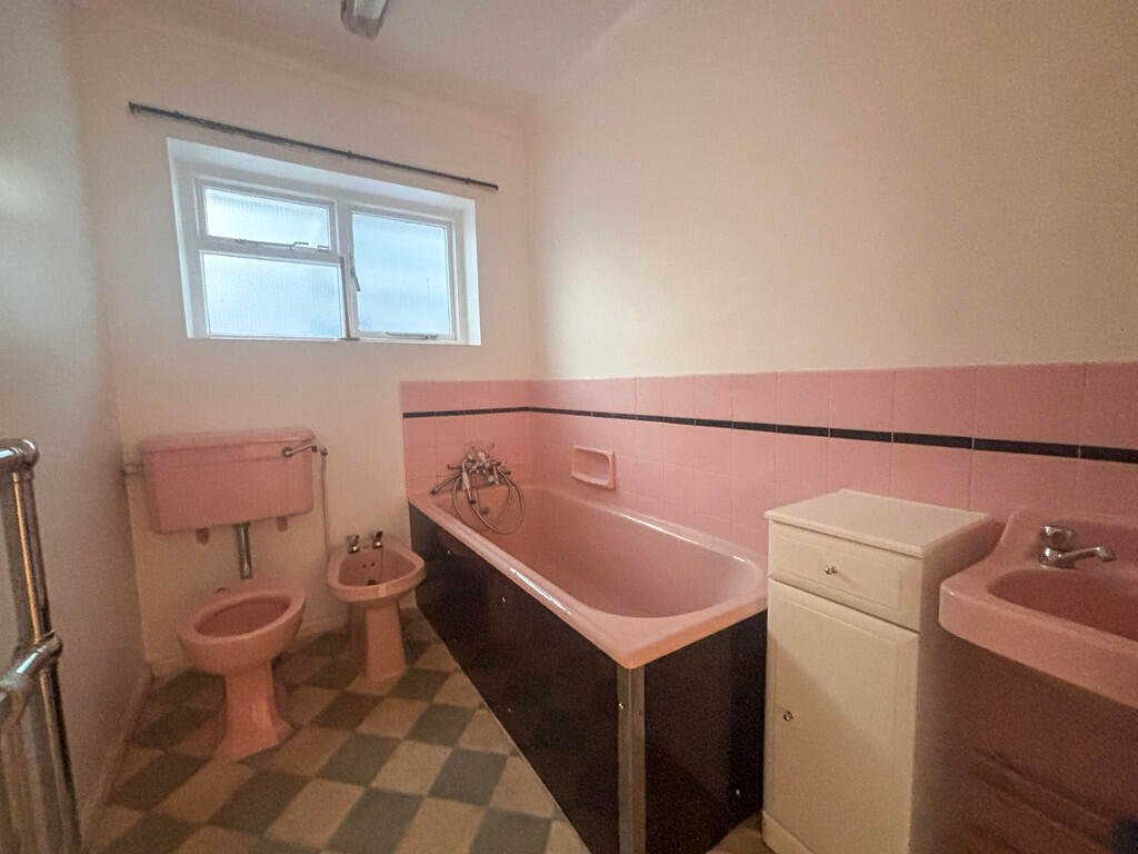 BATHROOM Recently repainted walls with pink toilet, sink, and bath.