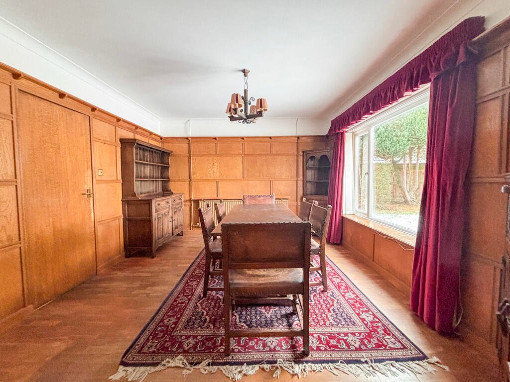 DINING ROOM A large dining area leading off from the lounge with windows looking over the garden. Wood effect panelled walls and wooden flooring.