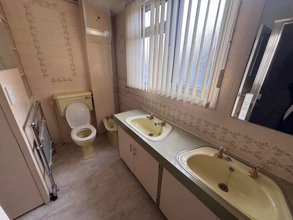 SHOWER ROOM Large shower room with double sinks, toilet and shower.