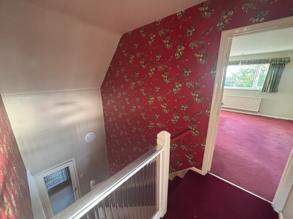 STAIRS/LANDING Off of the lounge leading to two upstairs bedrooms. Wallpapered with floral wallpaper.