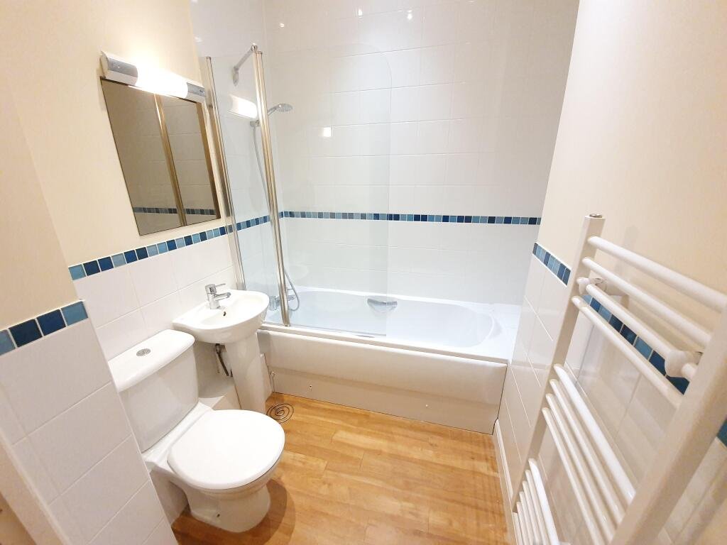 BathroomModern w/c, basin, bath with shower over, heated towel rail, hard vinyl floor, mirror with shaving point, downlights extractor fan.
