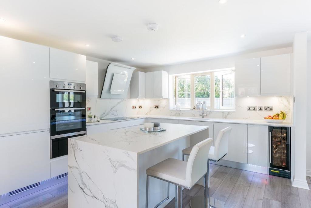 This modern home offers a generous entrance hallway, spacious cloakroom, open plan kitchen/diner with all appliances built in, including a full fridge, dishwasher, double oven and warming drawer,