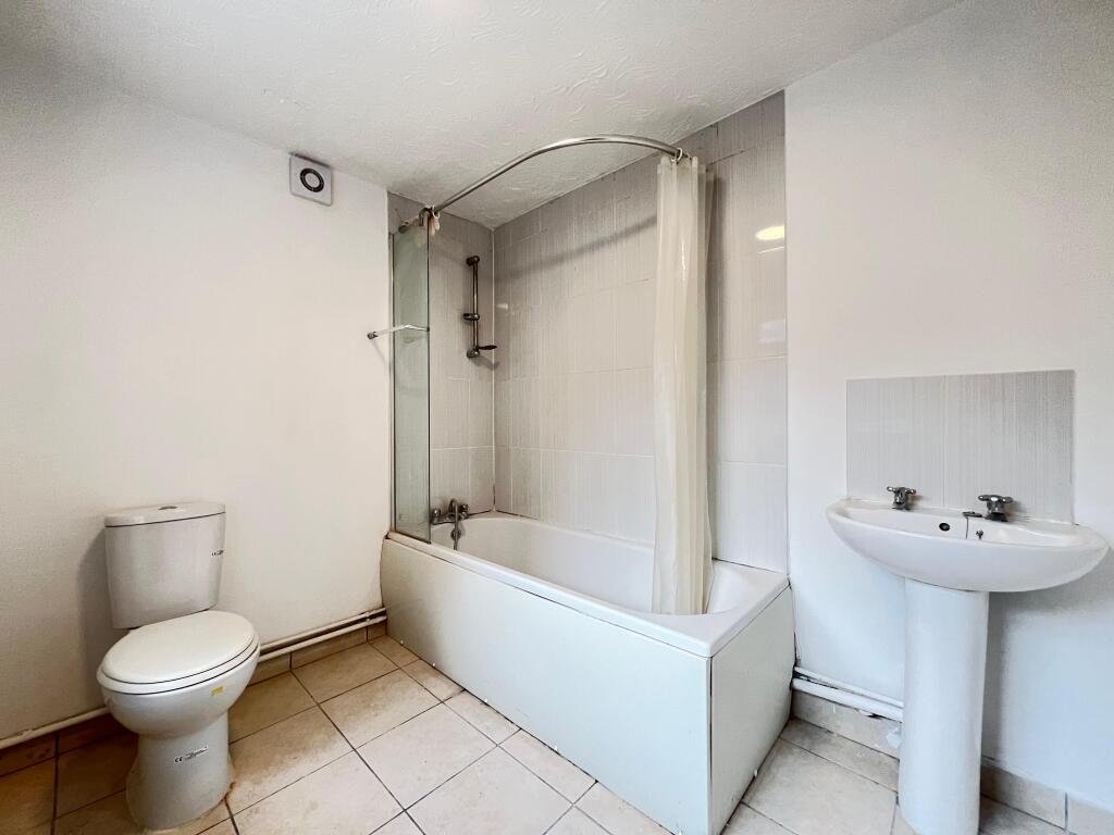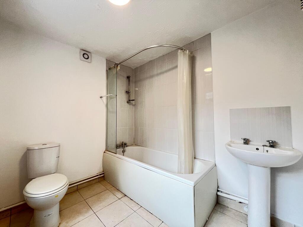 BathroomBath with shower over, WC, basin, tiled floor, window to the side aspect.