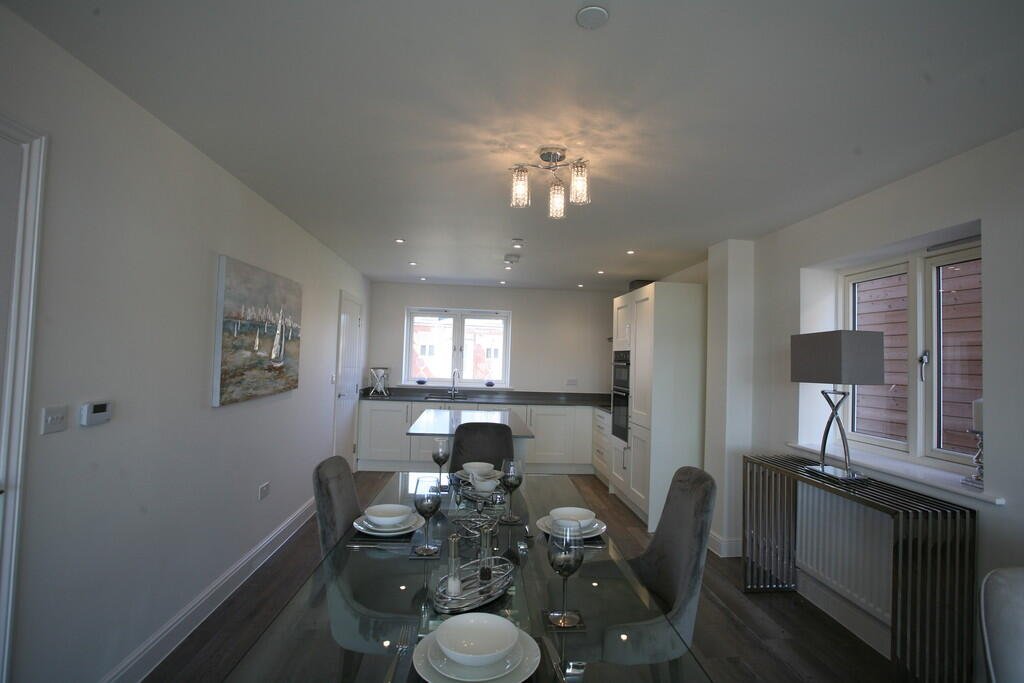 PROPERTY Upon entering the property the ground floor offers an integral garage, utility room with a range of base units and cloakroom. With stairs rising to the first floor there is a spacious hallway with access to the open plan kitchen, dining living area and a further cloakroom. The kitchen is a cream shaker style with integrated NEFF appliances and dark grey quartz worktop. The open plan living area has French doors to the large balcony offering beautiful views across the River Deben. The second-floor accommodation provides a family bathroom, master bedroom with en-suite shower room and balcony and