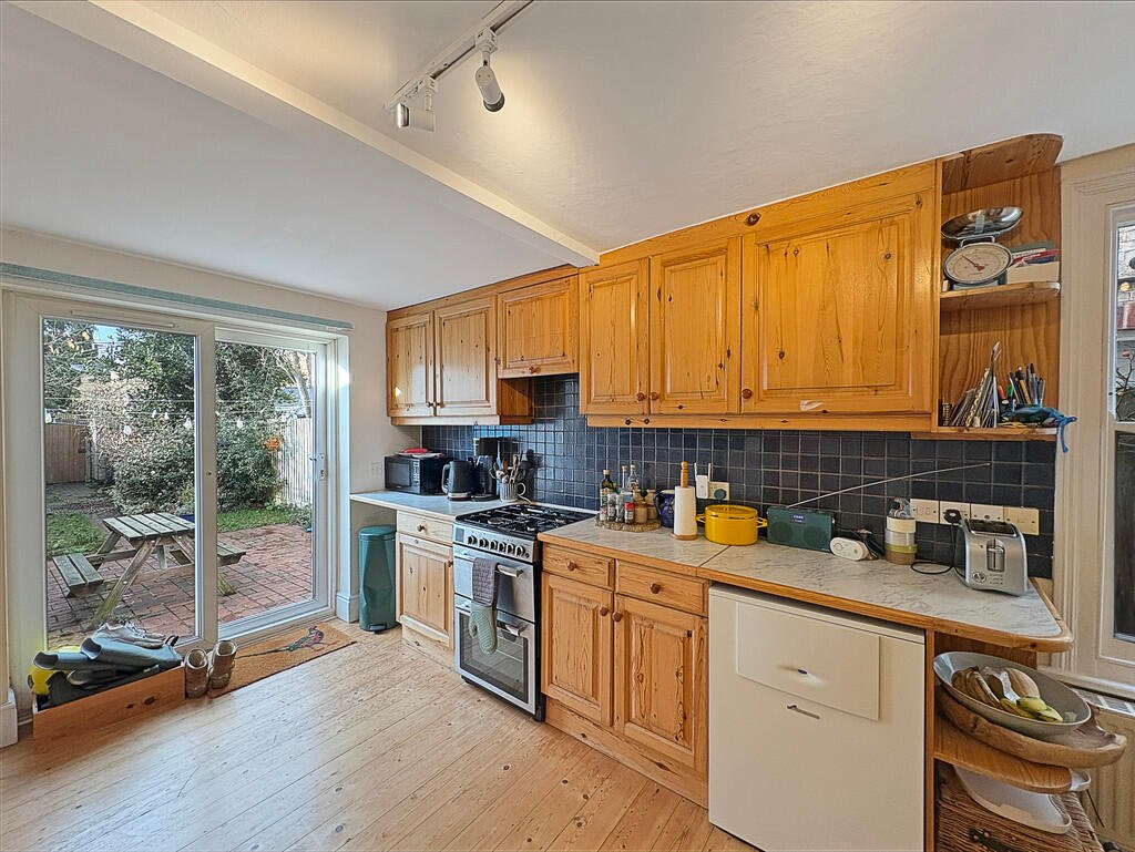 To the rear of the property is the fitted kitchen. The kitchen offers a range of wall and base units, practical worktop space and room for appliances, including fridge/ freezer, washing machine and dishwasher. A useful built-in storage cupboard provides additional space for household essentials. From the kitchen, a door gives direct access to the private rear garden, creating a pleasant connection between indoor and outdoor living.
