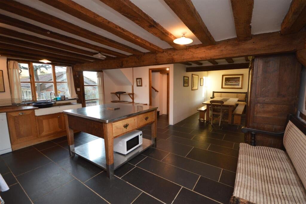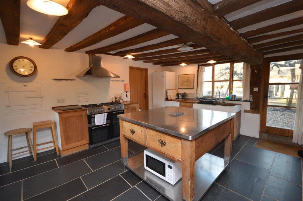 At the heart of the home lies the impressive farmhouse kitchen, a superbly proportioned space ideal for both relaxed dining and hosting. A charming exposed low beam subtly