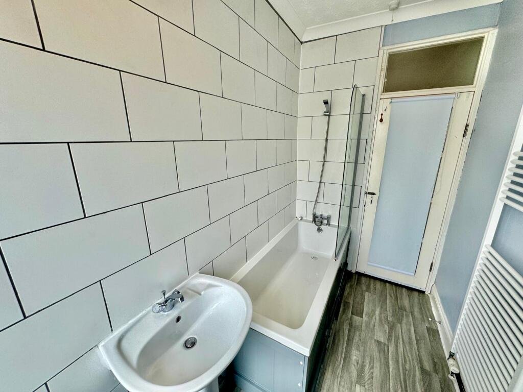 Bathroom New three piece suite comprising of bath with shower over, low level w/c, wash hand basin, vinyl flooring.