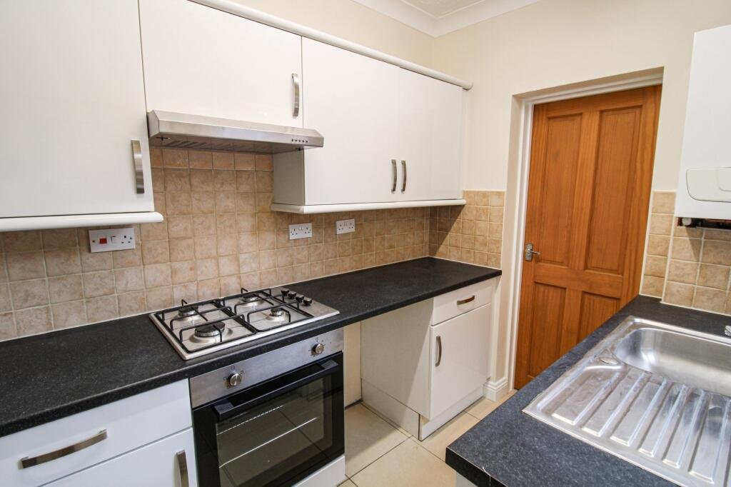 Flowing through from the second reception room is the semi-open plan kitchen, the dividing wall has been opened up to offer an open-plan feel, making the kitchen the heart of this home. The kitchen has a range of base and wall units, gas hob and electric oven, with undercounter space for white