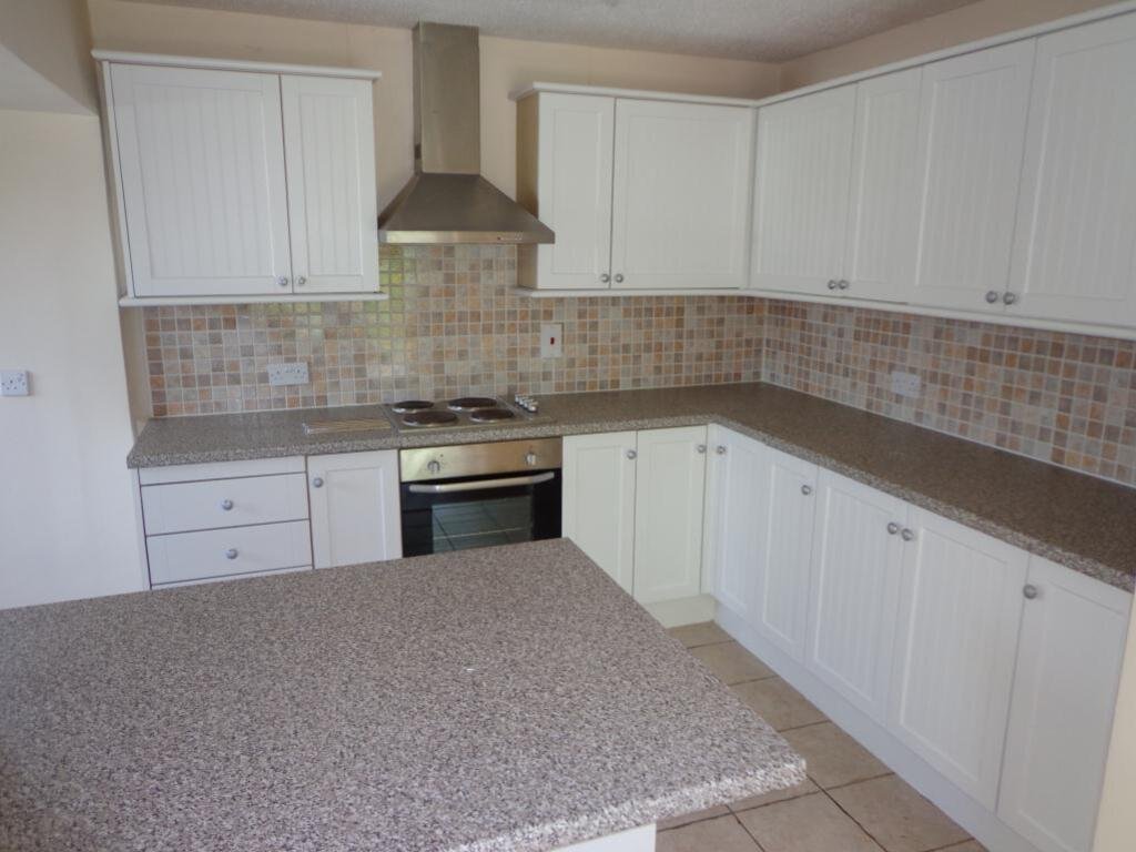 Fitted kitchen. Tiled flooring and a range of fitted wall and floor cabinets with complimentary worksurfaces, inset sink, integrated dishwasher, oven and hob.