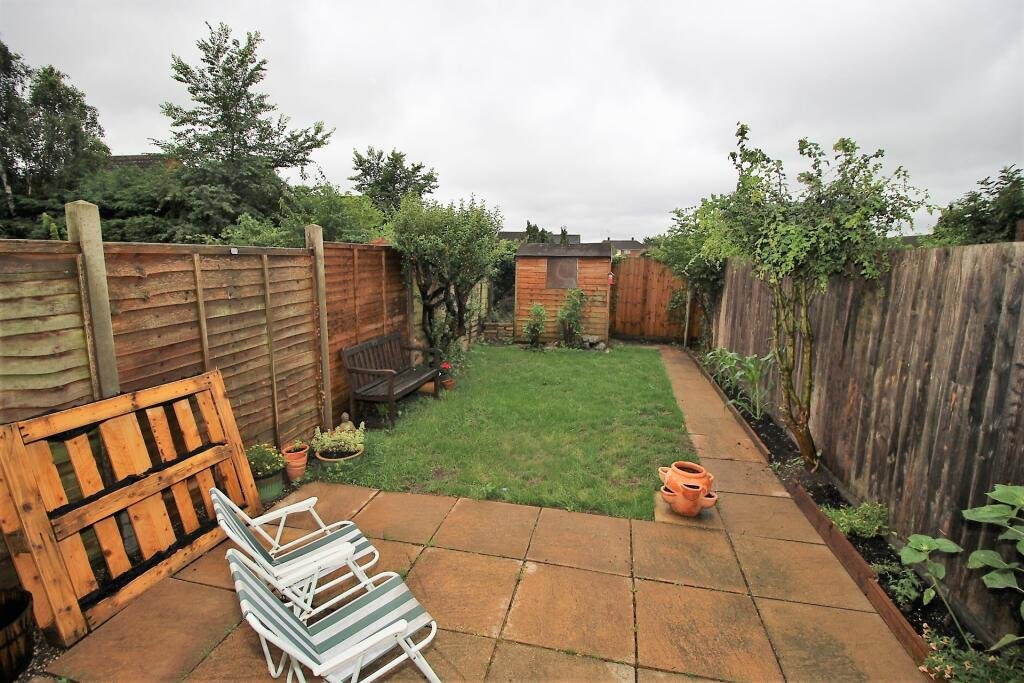 Enclosed rear garden, with paved patio area adjacent to the rear of the house leading onto a lawn. Timber shed and rear access gate.