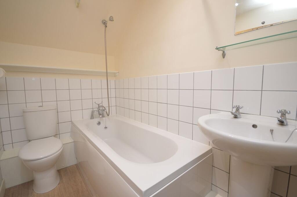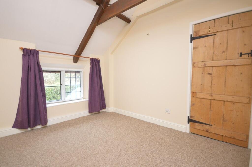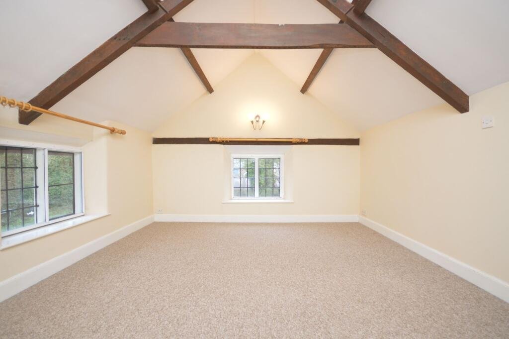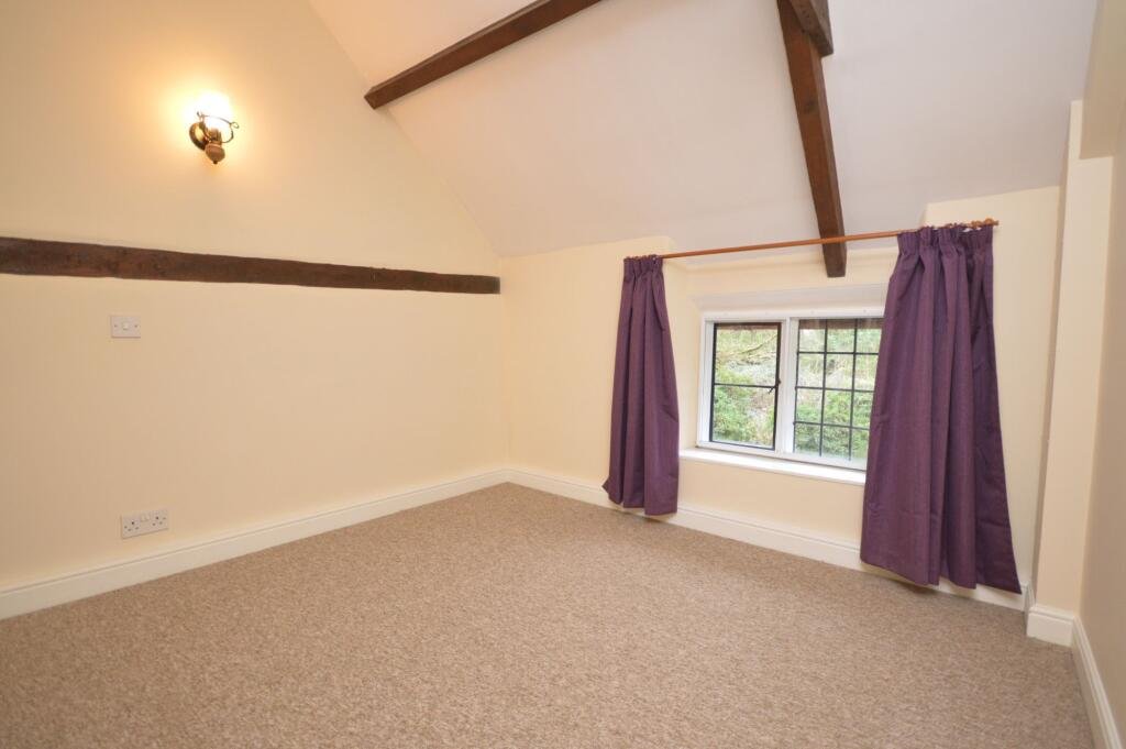 first-floor accommodation comprises two comfortable double bedrooms, both showcasing exposed roof timbers, complemented by a bathroom fitted with a shower over the bath, wash basin and WC.