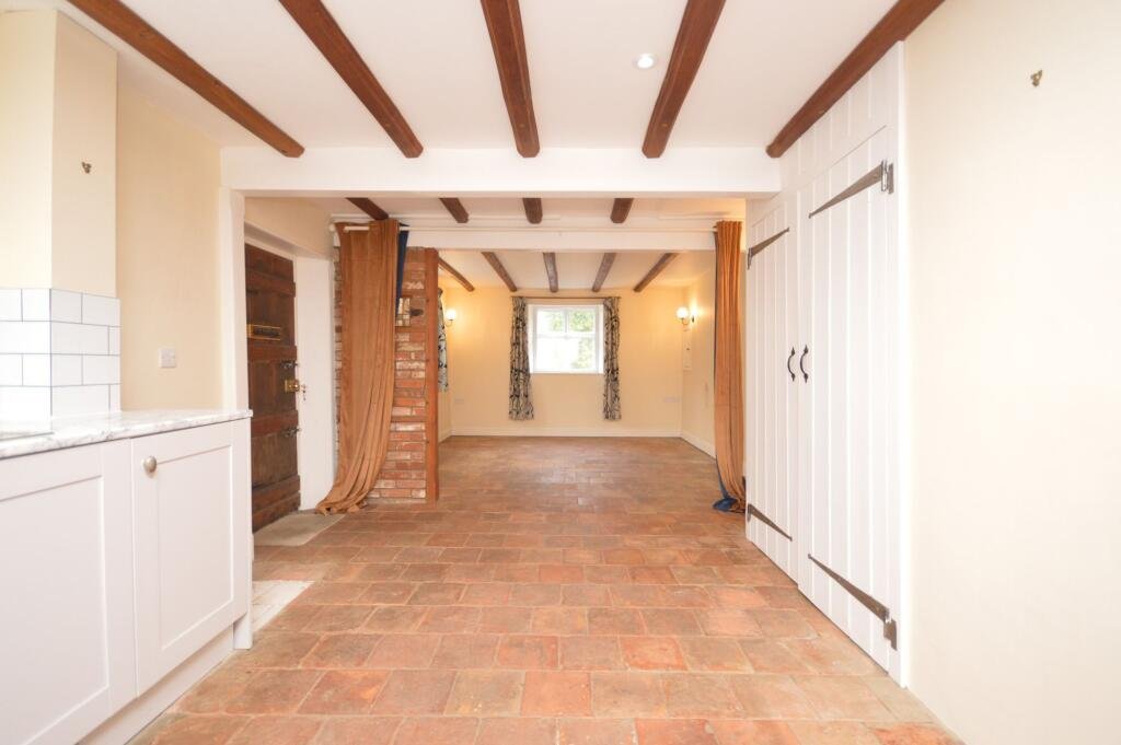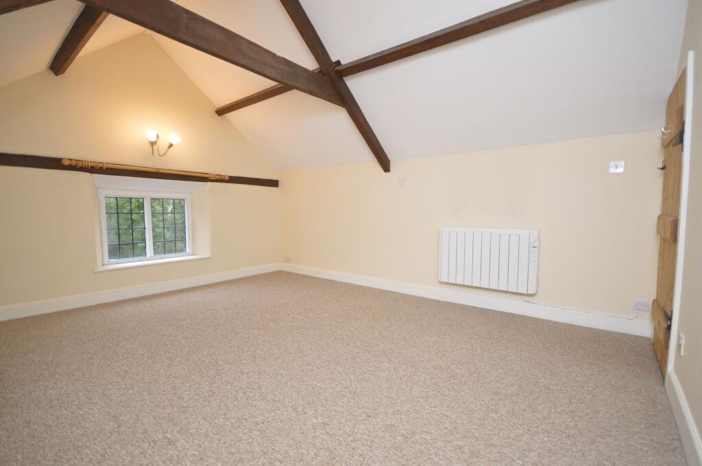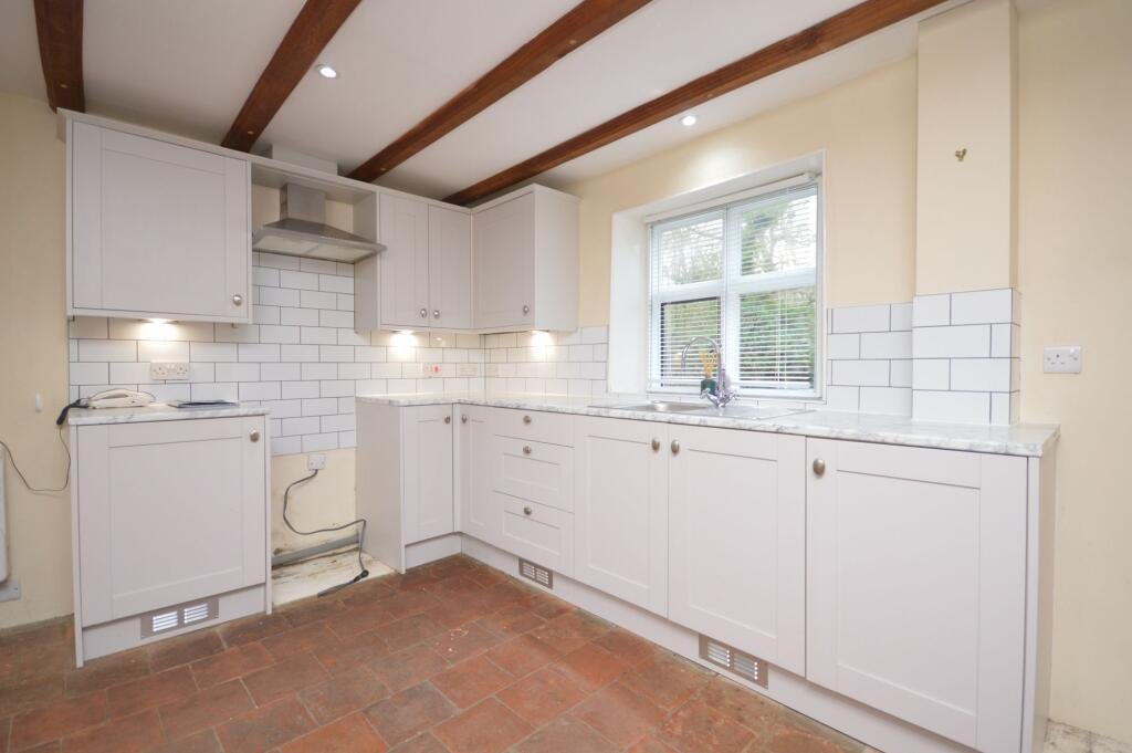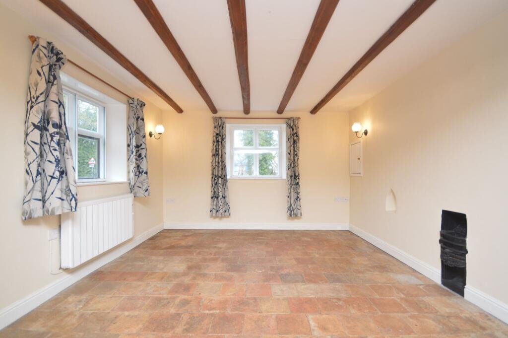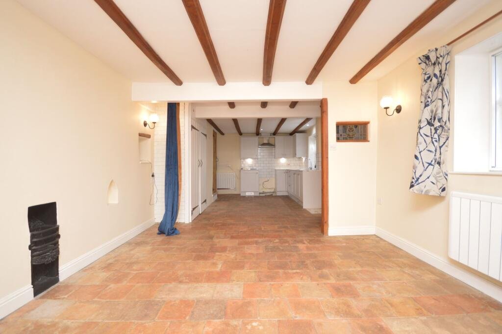 The ground floor offers an attractive open-plan layout with beamed ceilings, incorporating a kitchen/dining area that flows through to the sitting room. The kitchen provides space for all traditional white goods and includes plumbing for a washing machine. The cosy sitting room features a decorative fireplace, creating a welcoming focal point, ideal for both entertaining and everyday living.