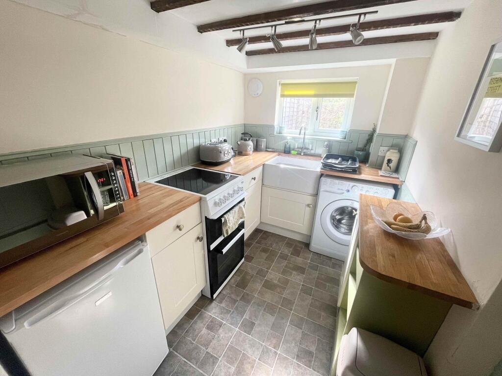 At the far end of the property, we have the characterful kitchen, with wooden beams on the ceiling, and solid wooden ‘stable style’ door leading onto the garden also. The kitchen is styled with a light kitchen suite with solid wooden worktops. Cream walls with an olive-coloured wooden backboard to style.