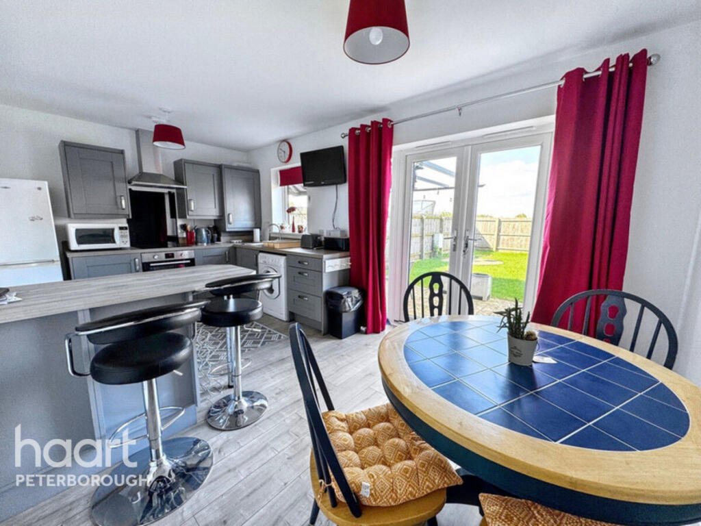 is a contemporary kitchen/diner fitted with a range of grey base and wall units, integrated oven and hob, and space for essential appliances. There is room for dining furniture, and double doors open directly onto the enclosed rear garden, offering an easy transition between indoor and outdoor space. A ground-floor cloakroom completes the downstairs accommodation.