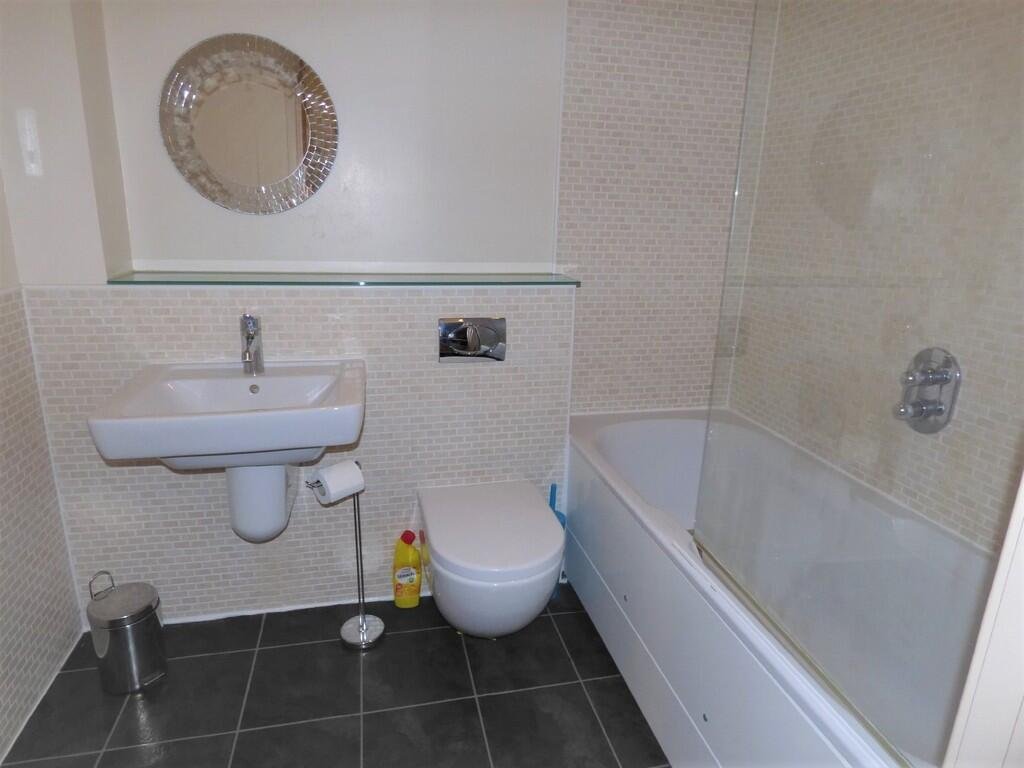 BATHROOM 7′ 5″ x 6′ 2″ (2.271m x 1.897m) A good sized bathroom with tiled flooring, fitted spot lights, and a painted/tiled walls. It comes with a wash basin, toilet, a fitted heated towel rail and a wider bath with a fitted shower screen and shower. Â