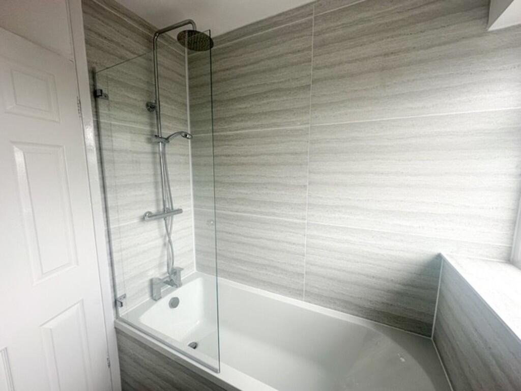 piece bathroom with over bath rain fall shower, wall tiles and glass screen protector, tiled flooring, large wall mirror, chrome radiator.Â