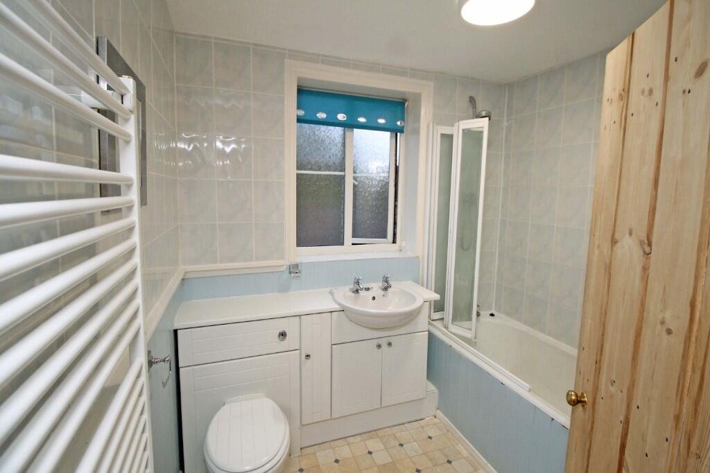 Vanity unit with washbasin, WC, panelled bath with fitted shower screen and shower over. Heated towel rail.
