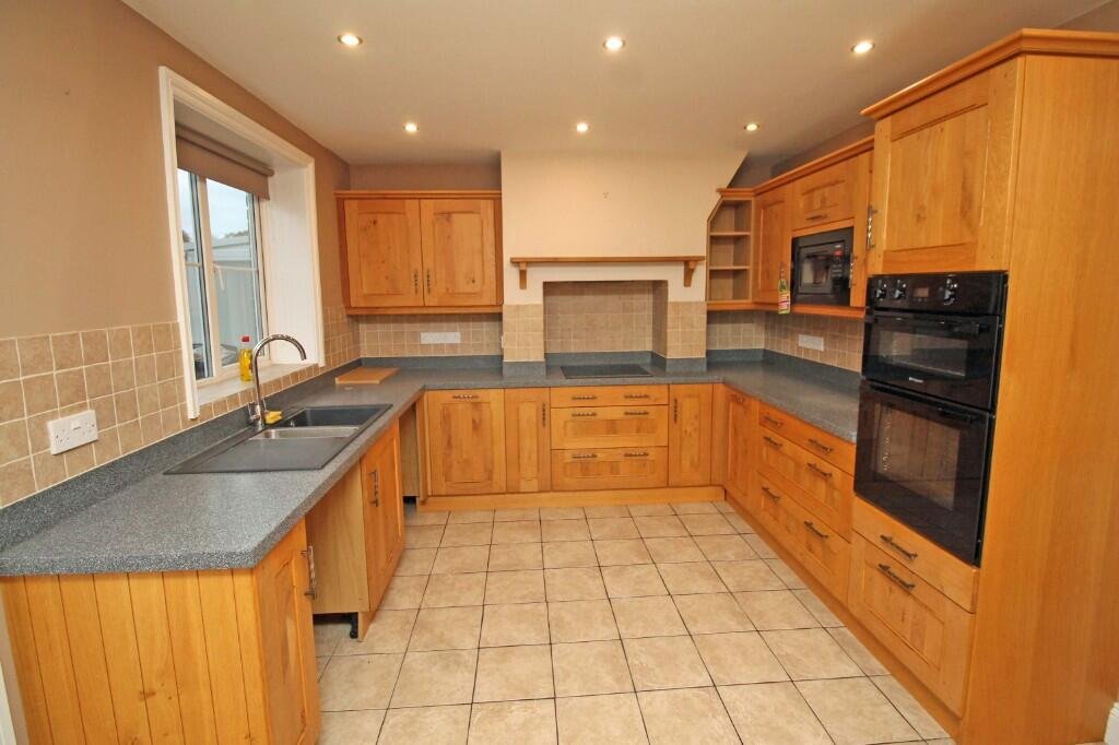 Range of oak base units with working surfaces over. Inset one and half bowl sink unit. Electric surface hob with extractor hood over. Fitted double oven. Fitted microwave. Tiled splashbacks. Range of matching wall units. Radiator. Cupboard housing LPG gas boiler for central heating and domestic hot water. Tiled floor. Door to rear courtyard.