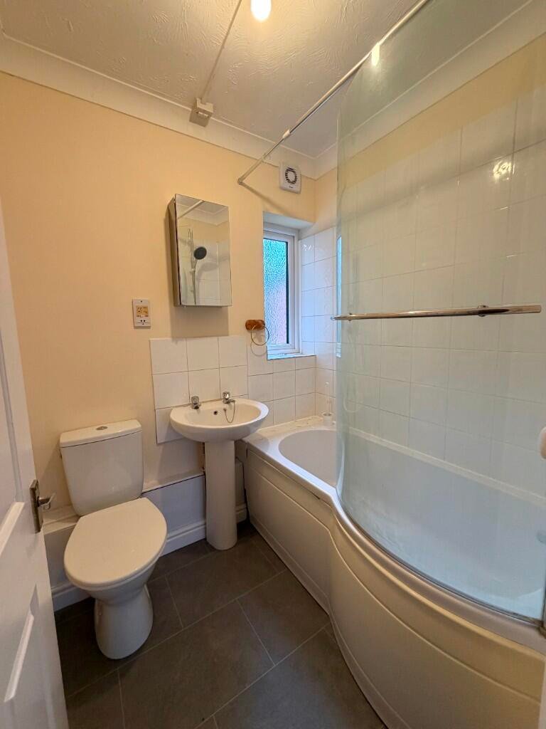 Bathroom: with panelled bath with shower over, wash basin, low level wc.