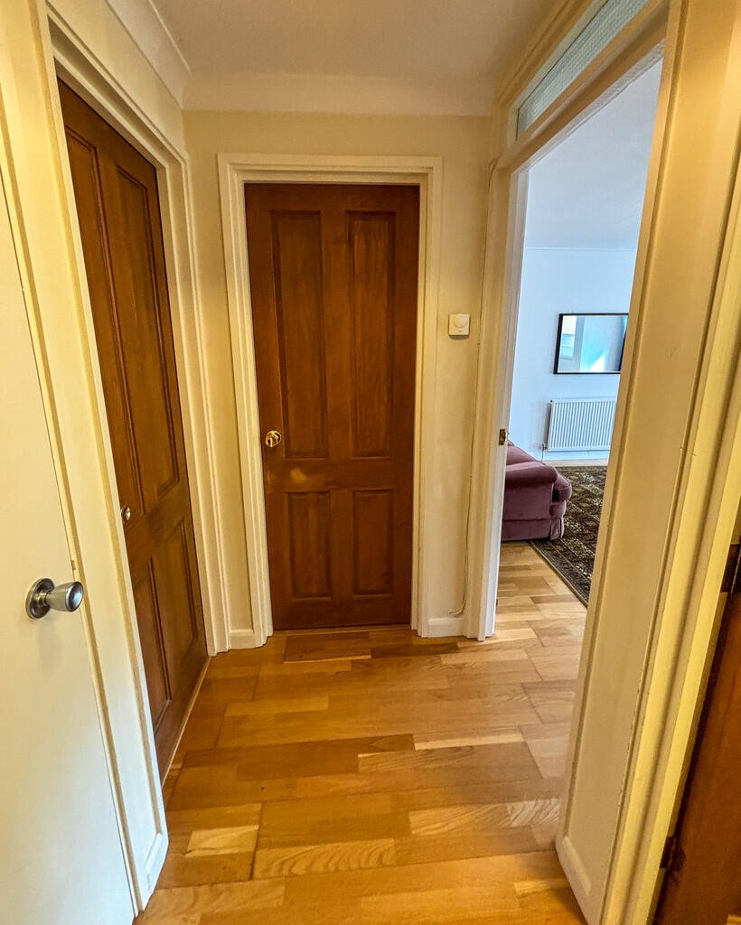 ENTRANCE HALLWAY With laminate flooring, intercom, radiator, and storage cupboard.Â