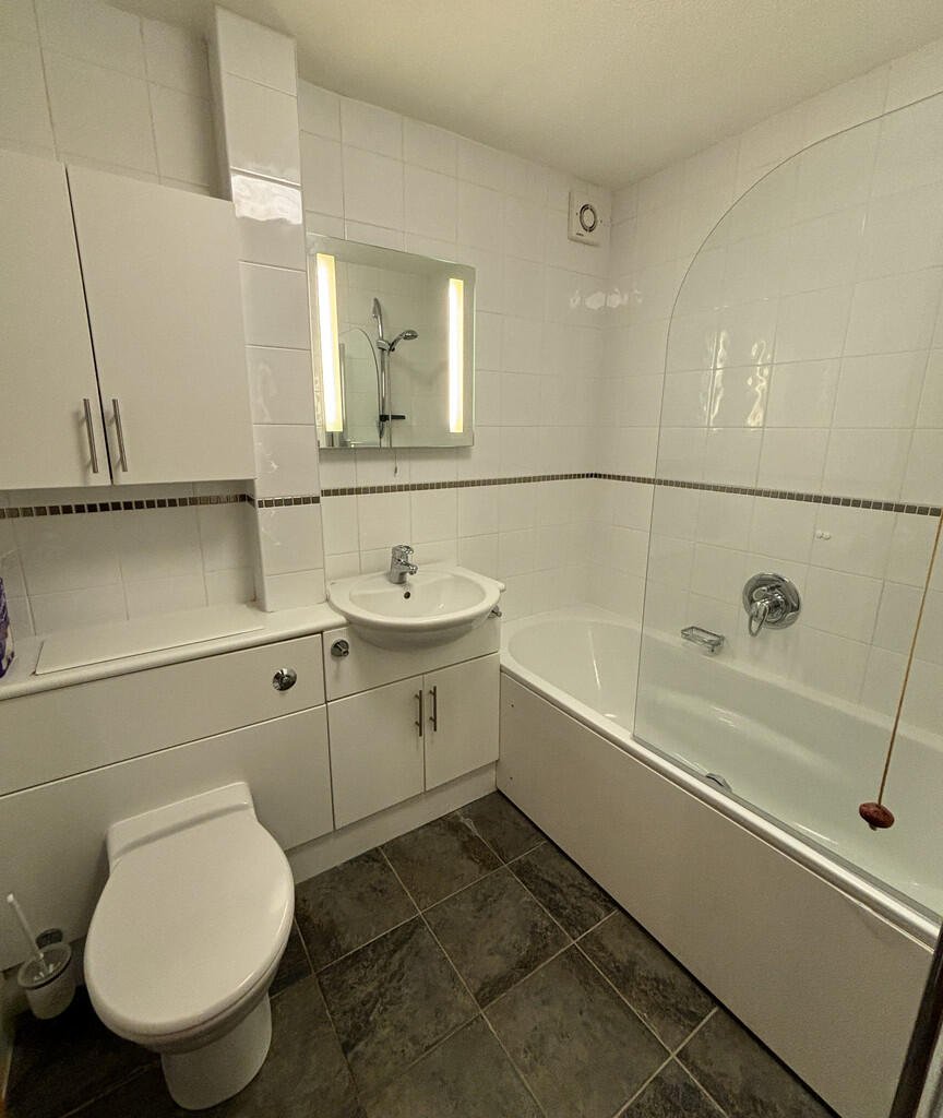 BATHROOM With tiled walls and flooring, storage cabinets, toilet, sink, mirror, extractor fan, bath and thermostatic mixer shower. Â