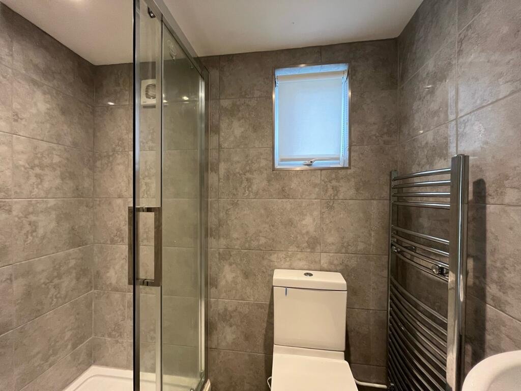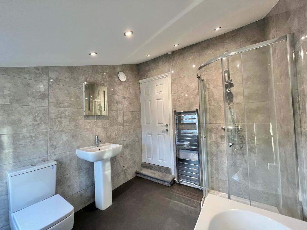 The bathroom comes with separate shower to bath but a shower hose attached to bath taps. Very modern with grey wall tiles and heated towel rail.
