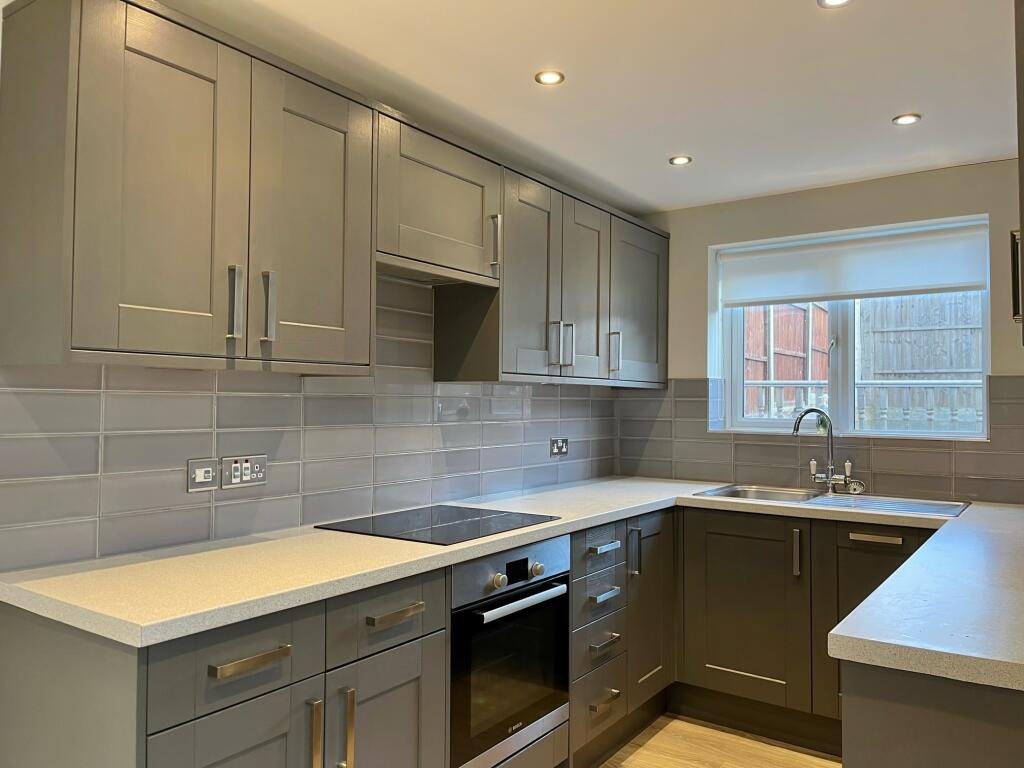 The kitchen has a contemporary feel with dark grey units and tiles and spotlights. Integrated dishwasher, electric cooker and hob along with space for your fridge/freezer. Access to the garden from here too.