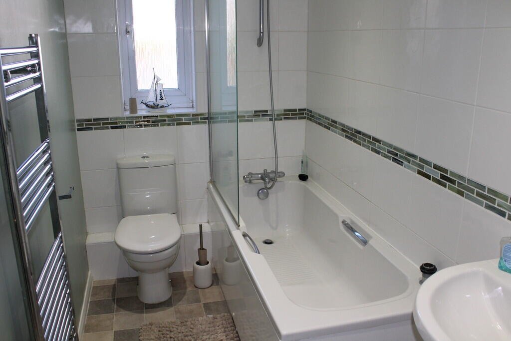 BATHROOM: 8′ 11″ x 4′ 10″ (2.72m x 1.47m) featuring heated towel rail, shower over bath, wash hand basin, WC