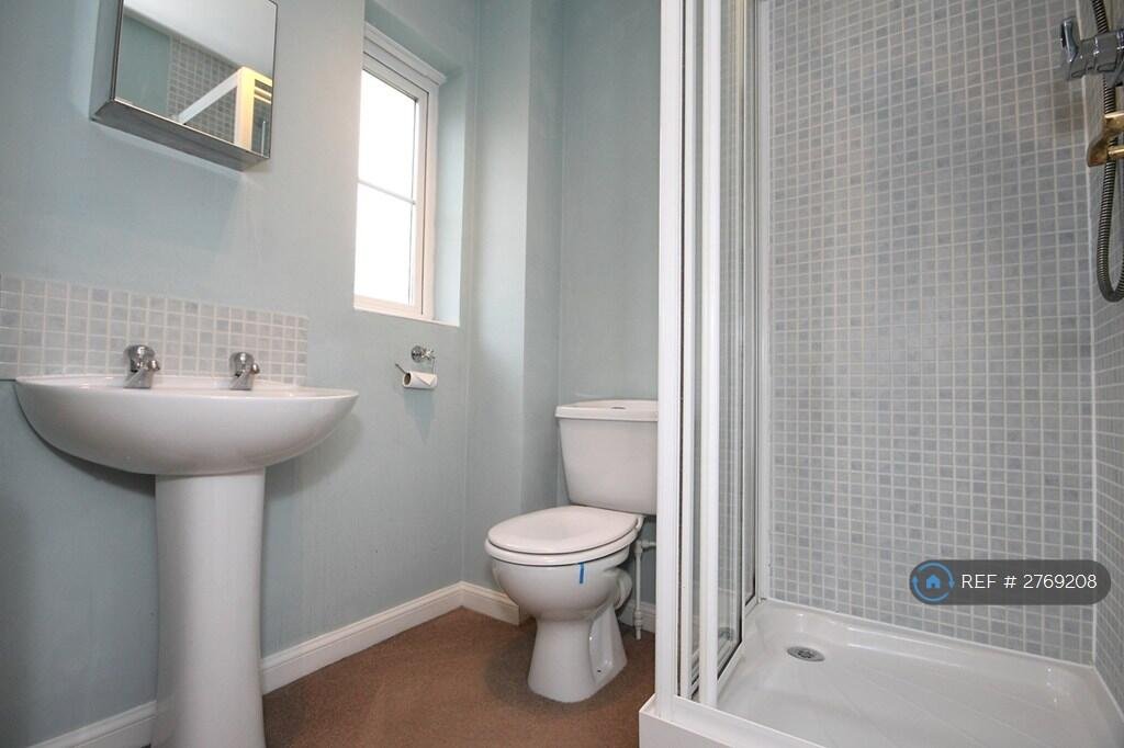 En Suite Low level WC, hand wash basin, shower cubicle, windows to front, radiator