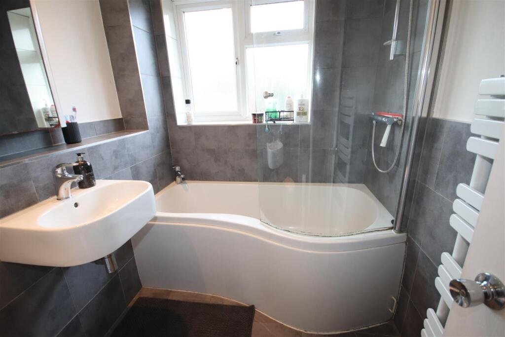 Bathroom – 2.1 x 1.9 m (6’10” x 6’2″ m) – Bathroom with shower over the bath