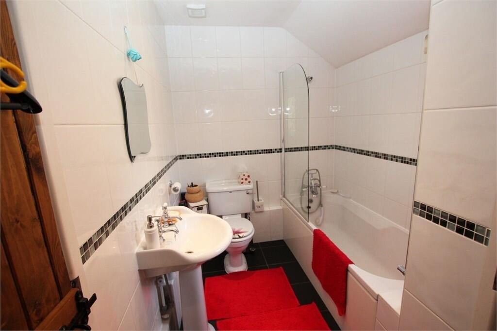 Bathroom Fitted with three piece suite comprising panelled bath with hand shower attachment over and folding glass screen, pedestal wash hand basin and close coupled WC, tiling to all walls, extractor fan, window to rear, airing cupboard, ceramic tiled flooring, recessed ceiling spotlights.