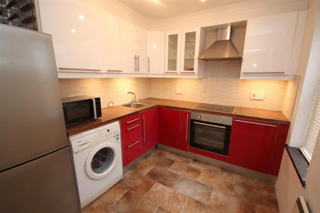 Kitchen – 2.75 x 2.37 (9’0″ x 7’9″) – A fitted kitchen located just off the lounge/dining room with electric hob and oven, washing machine and fridge freezer