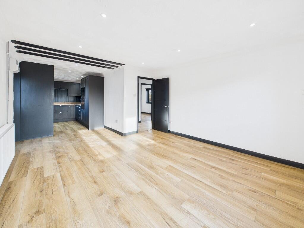 oven, microwave, space and plumbing in purpose built cupboard for washing machine and tumble dryer, integrated fridge/freezer, two radiators, dual aspect with windows to side and rear, wood effect laminate floor.