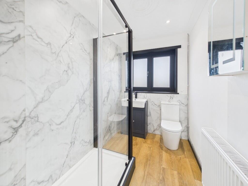 Rectangular shower enclosure with dual shower having a Rainfall head and handheld, Wash basin with vanity unit, low level WC, panelled walls, window to side, radiator, wood effect laminate floor.
