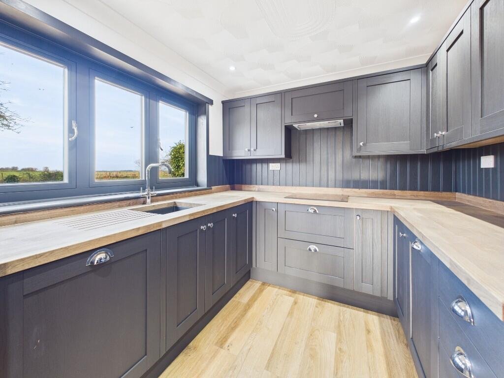 Fitted with a range of bespoke wall and base units with solid wooden work surfaces, single butler style sink unit, integrated dishwasher, Bosch induction hob with extractor hood over, multifunction