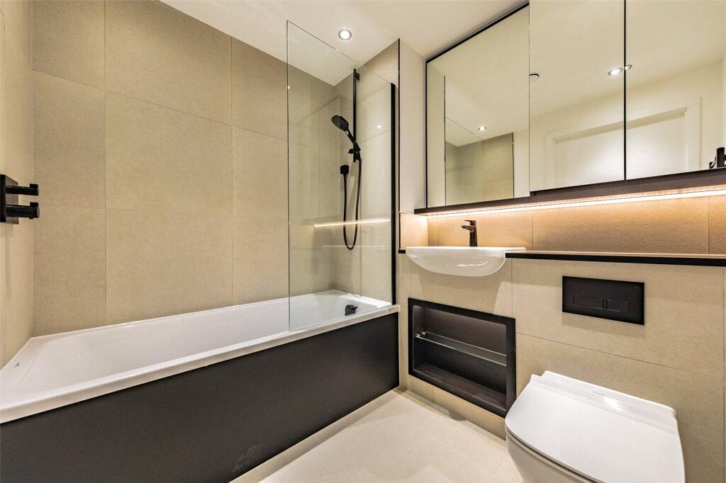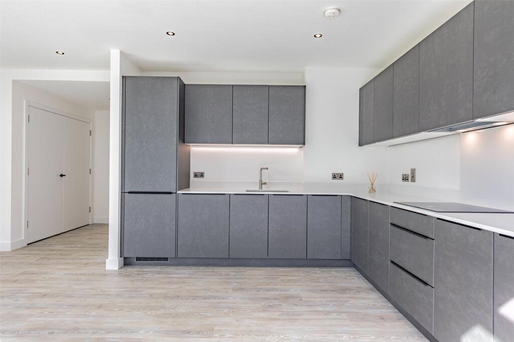This apartment provides a modern and stylish open plan living space with Amtico flooring and access to the balcony. A modern kitchen with integrated appliances including oven, hob, stainless steel sink, dishwasher, and fridge freezer. There is a washer/dryer in the hallway cupboard. Bedroom one with fitted carpet, built in wardrobe and en-suite shower room. Bedroom two with fitted cupboard and carpet. Bathroom with bath and overhead shower, heated towel rail and