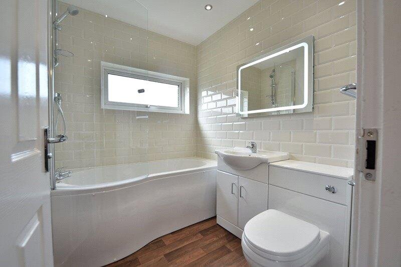 BATHROOM:White suite comprising of P-shaped bath with shower over, low level wc and handbasin built in vanity unit.