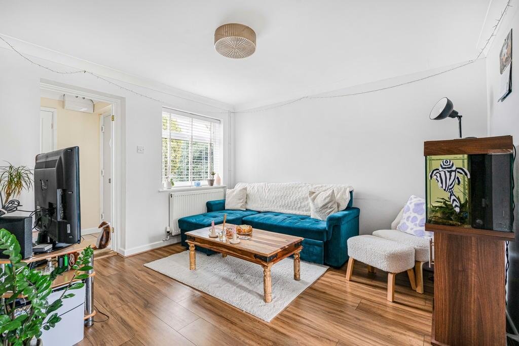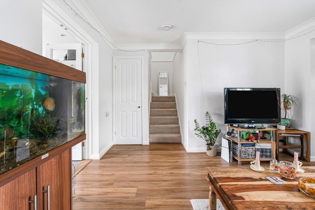 Living room With window to the front aspect, wood effect flooring, stairs to the first floor, under stairs storage cupboard, glazed double door to