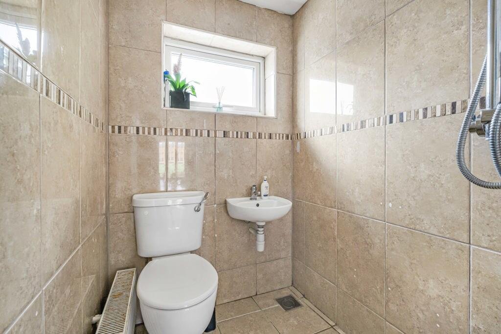 Guest cloakroom/ shower room With window to the front aspect, low level wc, wall mounted hand wash basin with chrome mixer tap, wet room style shower area, tiled walls, tiled floor
