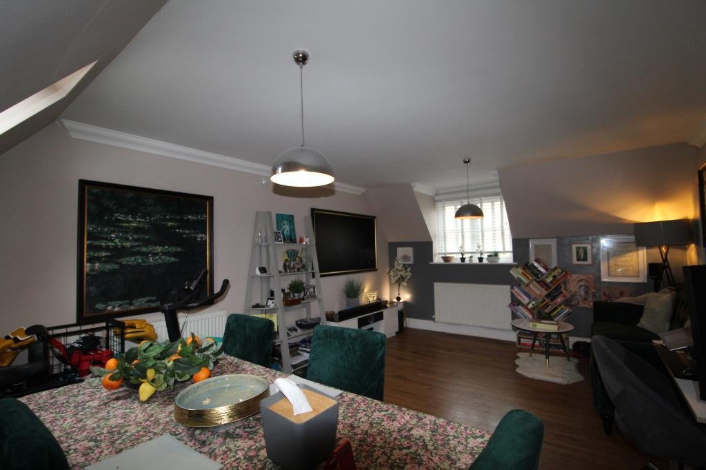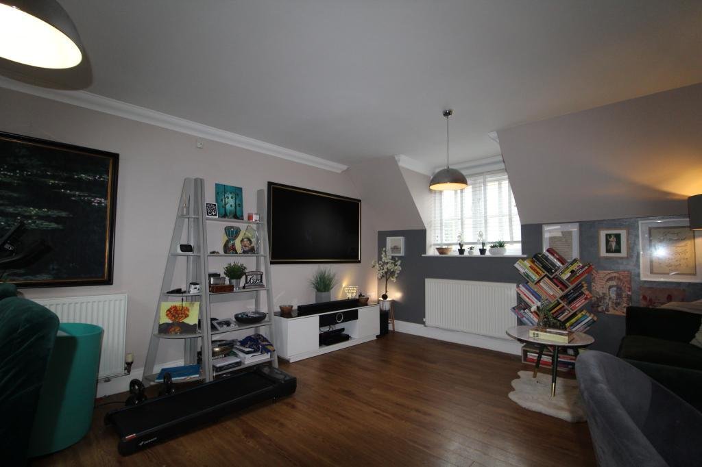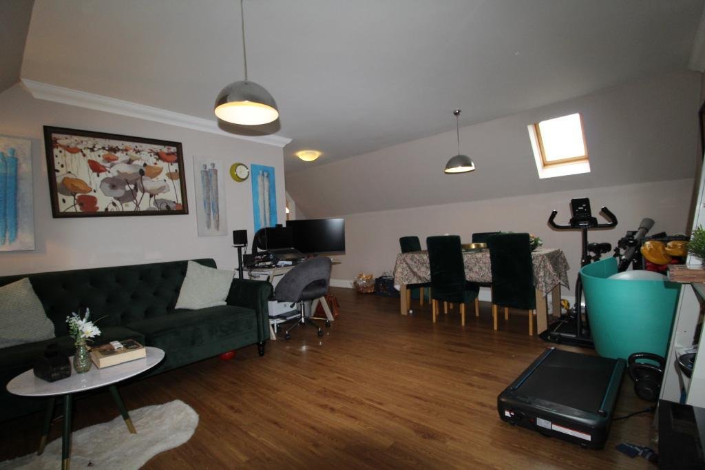 The property benefits from a bright and spacious living area measuring approximately 19, featuring laminate wood flooring, dual aspect windows including a Velux roof window, and two radiators.