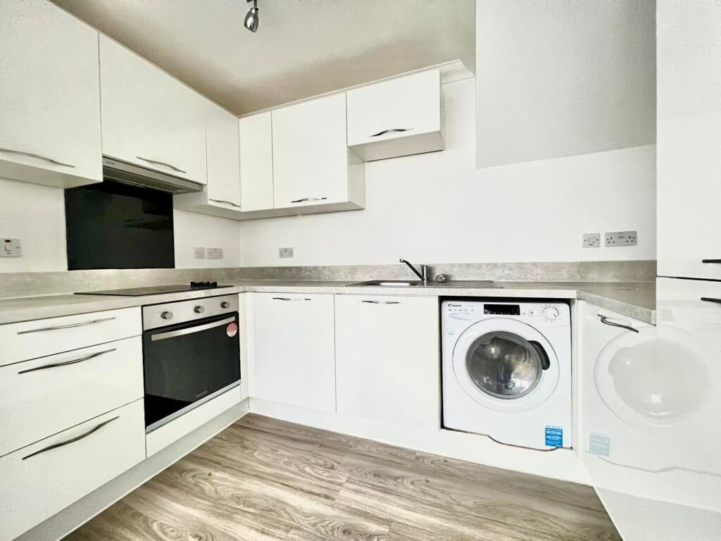 Kitchen Area 10′ x 6′ 1″ ( 3.05m x 1.85m )Fitted kitchen with a range of wall and base mounted units, one size bowl stainless steel sink with drainer unit, work surfaces, electric oven, electric hob, integrated washing machine, integrated fridge/freezer, and laminated flooring.