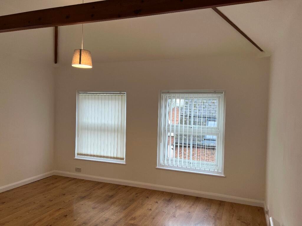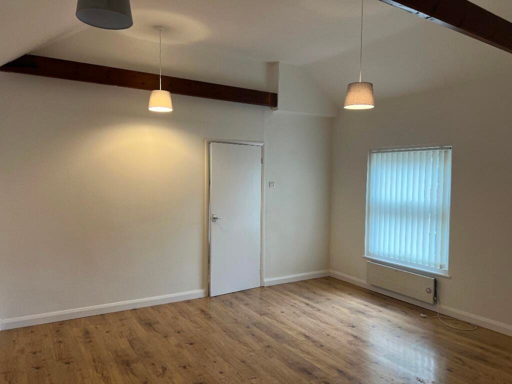Situated on the second floor, the property is accessed via a communal entrance hall with stairs leading to the flat. The accommodation comprises a bright lounge/dining area featuring a front-facing window and wood laminate flooring, creating a welcoming living space.