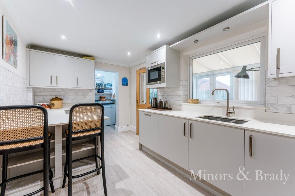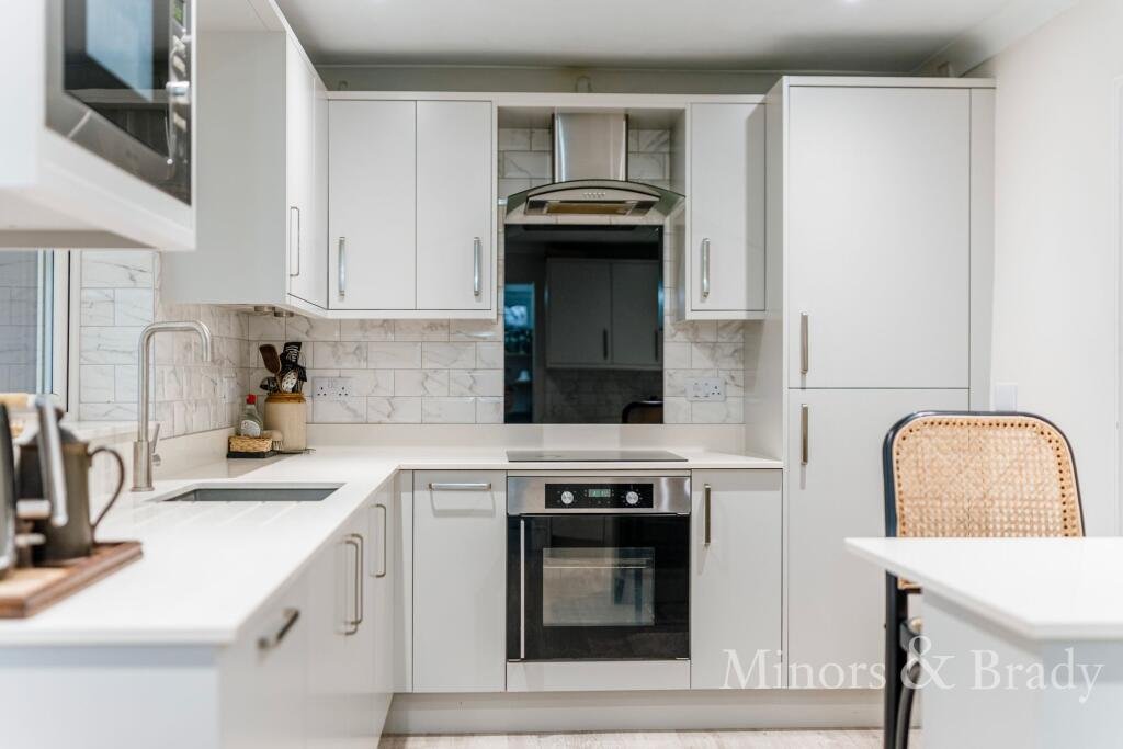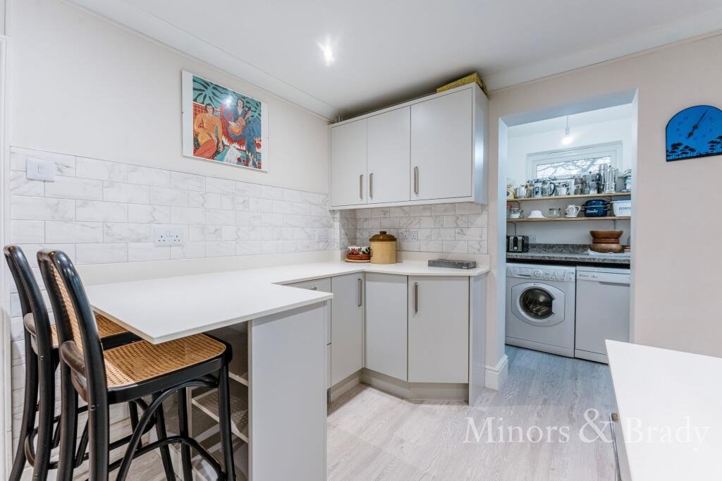From the lounge, the property opens through to the recently renovated kitchen, which has been carefully designed to maximise both workspace and storage. Modern fitted units are paired with integrated appliances, tiled splashbacks and tiled flooring, resulting in a clean and contemporary finish. A breakfast bar provides an informal dining option and a natural divide between preparation and seating areas.