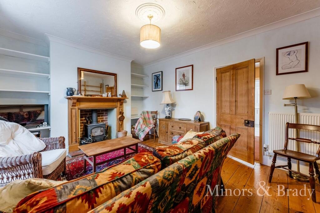 Stepping through the front door, you are welcomed into a well-proportioned lounge positioned at the front of the property. This inviting space features exposed wooden flooring and a wood-burning stove set within a character fireplace, creating a strong focal point and a warm atmosphere. A front-facing window allows plenty of natural light, while the room comfortably accommodates both seating and freestanding furniture.